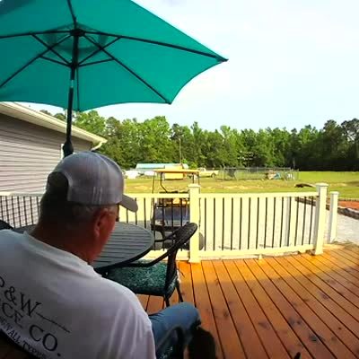 A man sits down at a patio table on his deck. Then the wind lifts the table umbrella out of the table and carries it away and over the roof. Security footage.