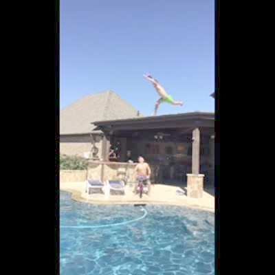 A man runs off a roof and hits the concrete on the side of a swimming pool hard before he falls in the water.