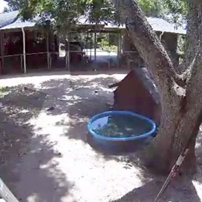 While she tries to help her husband with construction on the patio roof, a woman climbs up a ladder and loses her balance. She falls to the ground and rolls into a swimming pool. Security footage