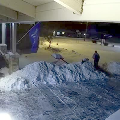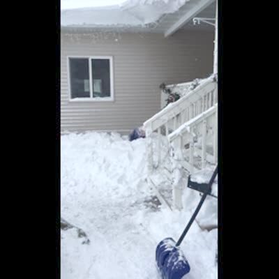 A young woman shovels snow when a massive amount of snow falls off the roof, and engulfs her. Security camera footage.
