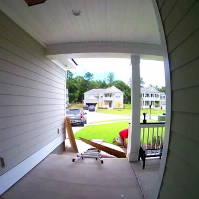 A male construction worker walks into a ladder and hits his head when he tries to walk up the front porch steps. Security footage.