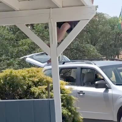 A car pulls into the garage and knocks two kayaks off the roof and they fall in the driveway. Security footage.