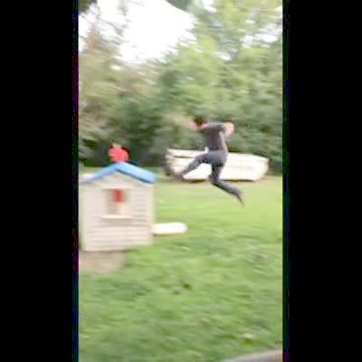 A man jumps off the roof of a house, in slow motion, onto a bounce slide in the yard. He bounces off the slide and crashes into a tree.
