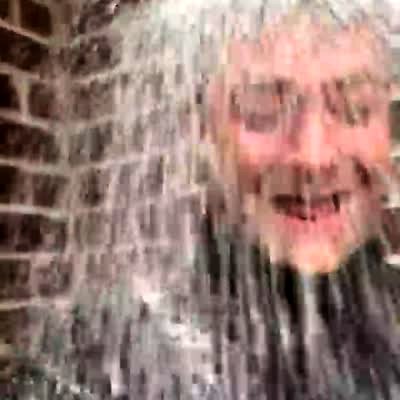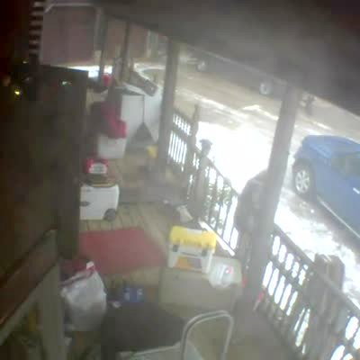 Sleet falls outside the house and it pours off the roof onto the ground. A man stands under the stream of sleet and laughs.