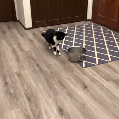 A cat flinches every time a roof leaks water into a metal pot on the floor of a living room.