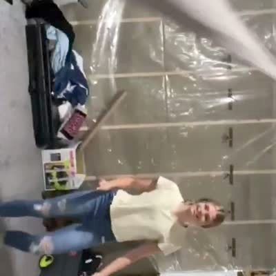 A teen boy on the upper floor of a house chips a ball with a golf club into a cup as the cup rotates on a ceiling fan and he shouts "Let's go!"