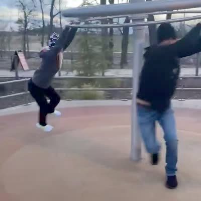 A woman falls when she hangs from a play structure that spins her at a playground park.