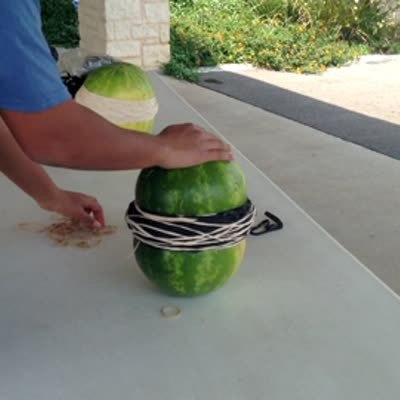 Three boys wrap rubber bands around a watermelon outdoors and when the oldest boy picks it up to show the camera, it explodes in his hands. The clip plays again in slow motion.