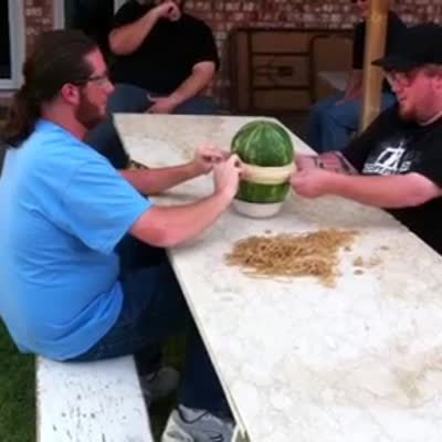 A man and his sons put rubber bands on a watermelon on until it pops. AA: Rubber Band Watermelon Challenge.
