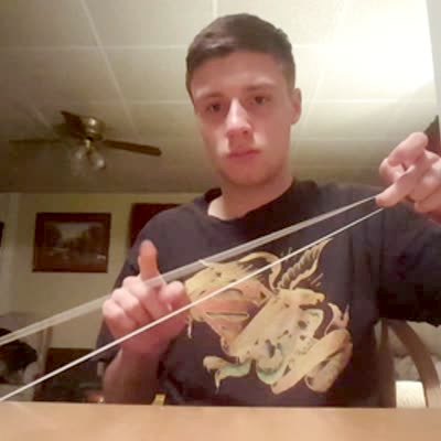Two boys wrap rubber bands around a watermelon on a table at home until it suddenly explodes, breaking a light fixture above it at 3:40