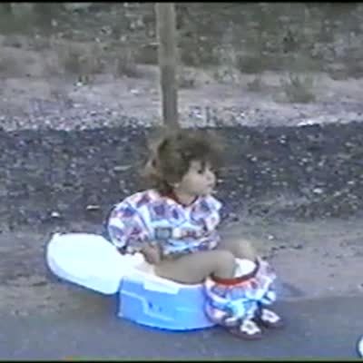 Tot girl outside in her potty chair going to the bathroom under a sign that says No Dumping. AA: Funny signs.