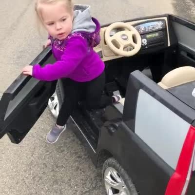 A tot girl steps out of her toy car in the street and her mother tells her she can't stop there. The tot says "no, I'm too busy!" and slams the car door.