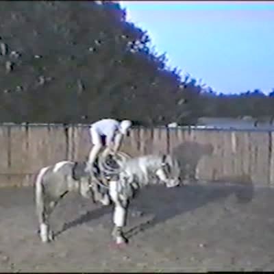 Boy on horse stands up on saddle, swings his rope lasso & falls backwards after horse moves suddenly. Short recovery.