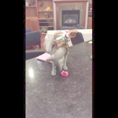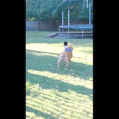 A pit bull dog is wearing a saddle with a cowboy doll on top and acts like a real bull trying to dislodge it outdoors.