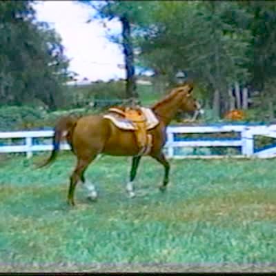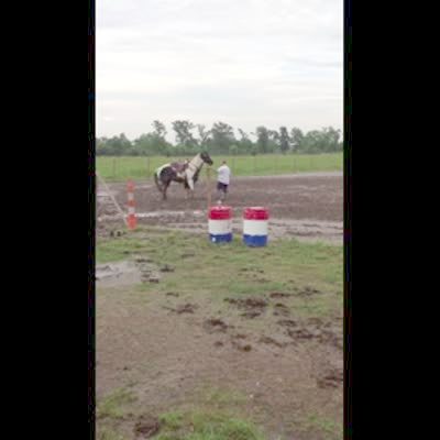 Teen girl lays across the saddle of a horse, the horse bucks her off and she lands off camera with a thud. Then the horse falls over.