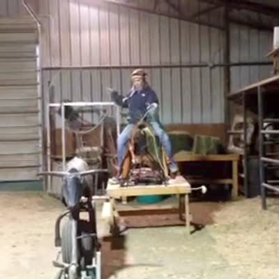 A woman sitting on a saddle in a barn falls off of the stand while trying to lasso a fake cow.