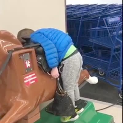 A boy tot rides on an horse ride at a grocery store. He lays across the saddle flat on his stomach.