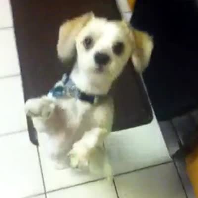 Dog stands on back paws at door and appears to be dancing to salsa music. Montage maybe.