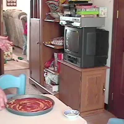 Tot girl tastes sauce that tot boy & Grandma / senior woman used to make pizza & spits it back out onto pizza pan. Gross.