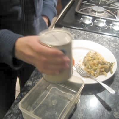 A can of cranberry sauce makes a strange noise while a woman tries to pour it into a container.