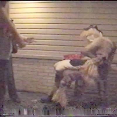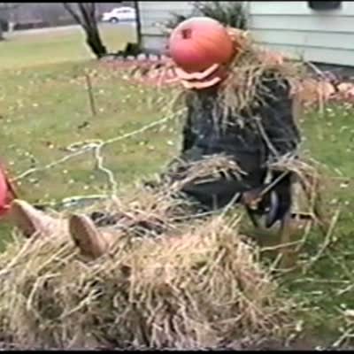 A talking mechanical scarecrow Halloween decoration sits in a lawn chair on the front porch of a house, with a censor on the doorstep, to activate it. A young girl in an inflatable costume trick-or-treats, and walks to the house. The scarecrow jumps and screams, and the girl screams and runs from the house. Secondary source, from home security camera.