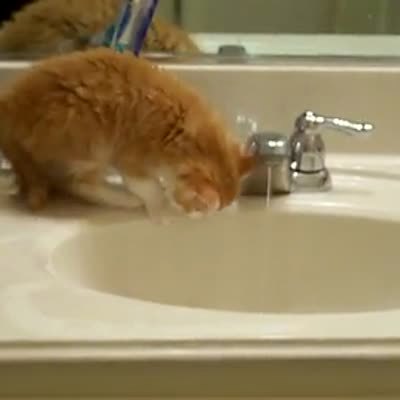 A hairless cat walks along the edge of a filled bathtub and another cat pushes him into the water, causing him to freak out and jump out.