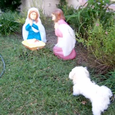 Christmas show at Baptist church. Nativity scene. Everyone on stage is singing Happy Birthday Jesus and little girl comes from audience and steals the baby Jesus doll from manger. Another tot takes the doll back and puts it in the manger.