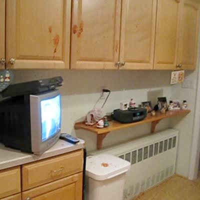 "Marinara Nightmare" The woman behind the camera shows the aftermath of grandma having spilled tomato sauce in a kitchen. Sauce is on the floor, the cabinets, and even the ceiling. Grandma shows herself, and is also covered in sauce, but grandma doesn't find it so funny.