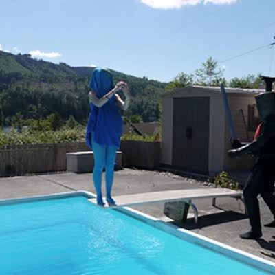 While filming a scene a teen boy dressed as a black knight falls into a pool.