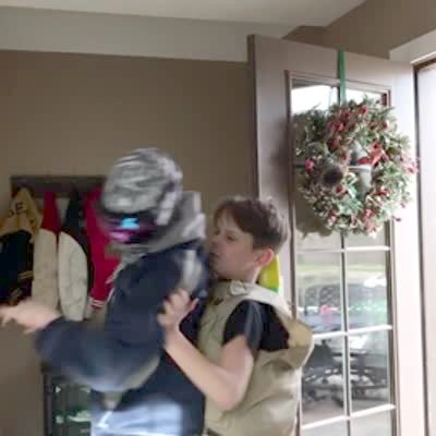 A man holds a baby and performs the "funny how" scene from the film Goodfellas that causes the infant to laugh.
