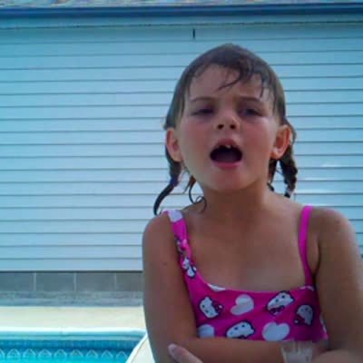 "Little Scene Stealer" A little girl is trying to record a video for her dad by pool. Her tot sister starts babbling and little girl folds her arms and impatiently waits for her to finish. "When is she gonna stop?"