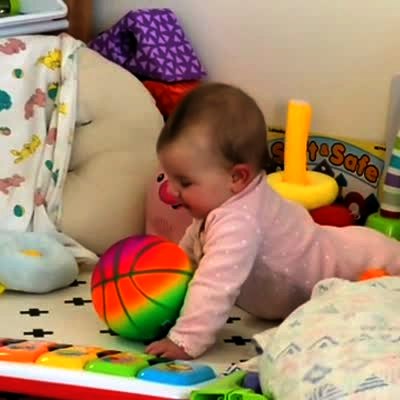 A woman records a baby girl, but a dog moves in and stands in front of the camera to steal the scene.