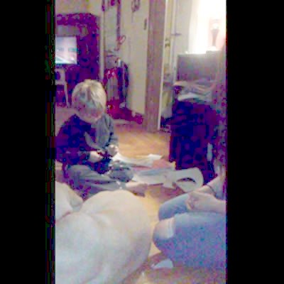A man asks his crying tot boy what he did as he films scraps of dollar bills on the floor that the boy cut into pieces. His dad reminds the boy to ask him before he cuts things up and informs him that he cut up 80 dollars.