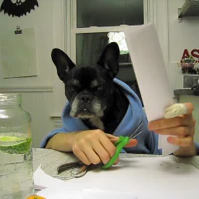 A small dog with human hands uses scissors and folded paper to make paper dolls.