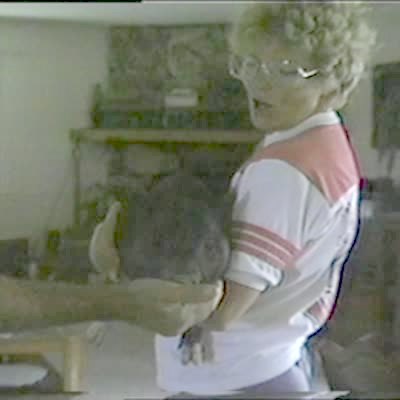 A senior woman walks into a dining room and gives some food to a boy. The camera woman walks up behind her and laughs. The senior woman gets scared. She yells, squawks, and flaps her arms. Short tails.