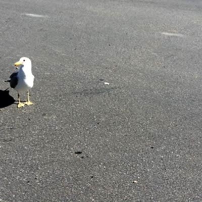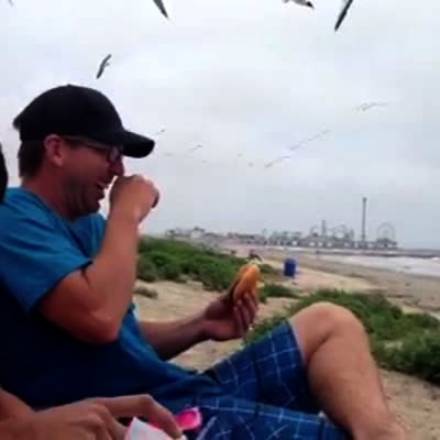 A man eats a cheesesteak on the beach when a seagull steals it out of his hand. Music rights not cleared.