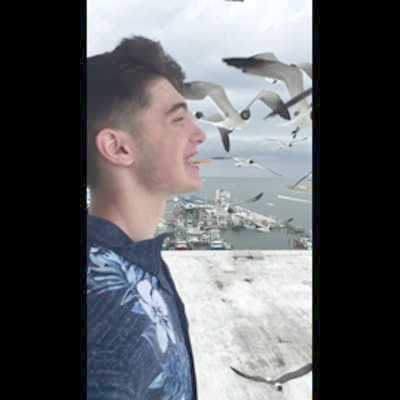 A teen boy holds a piece of food out with his mouth at the beach and a seagull bird flies over and takes the food out of his mouth in slow motion.