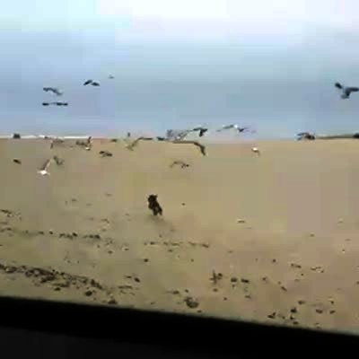 A dog barks inside a car at seagull birds flying outdoors at the beach before he suddenly jumps out the window and runs after the seagulls.
