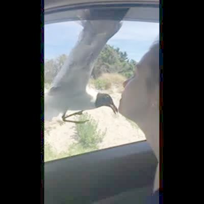 A man puts a French fry through the sunroof of his car to feed a seagull bird but the bird flies into the car and gets stuck. He screams and a woman screams and laughs and says the bird pooped inside of his car.
