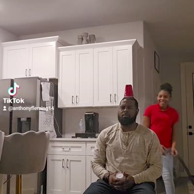 A man in the kitchen wears a cup on his head and says, "I trust my daughter." A young girl tries to hit the cup off the dad's head with a belt but misses and hits him the face.