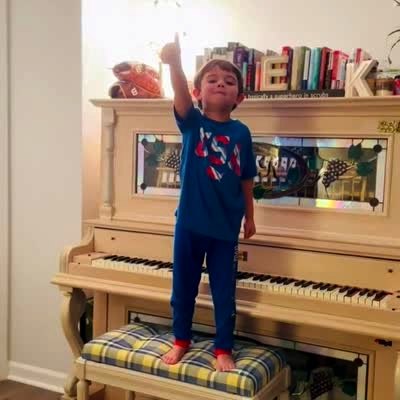 A tot boy stands on a piano seat in the living room and requests to Alfonso that he get more "piano videos." The boy then plops onto the piano keys.