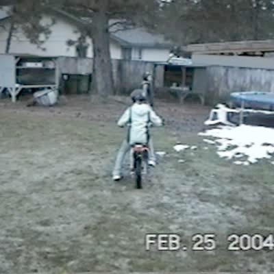 Young girl rides a dirt bike into a fence and breaks a panel section of it.