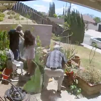 A section of fake grass blows off a front yard, and hits a man and woman. Two men grab the grass and place it back on the ground. No audio. Security footage.