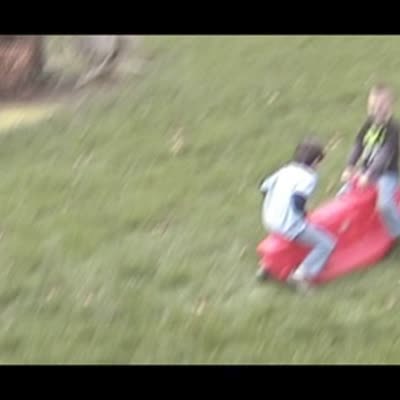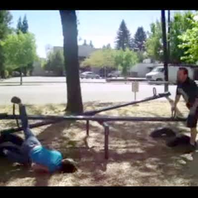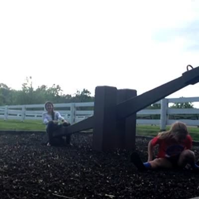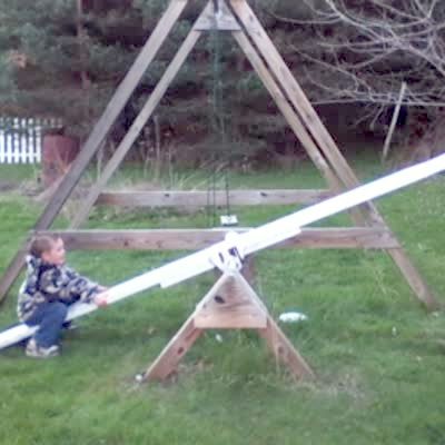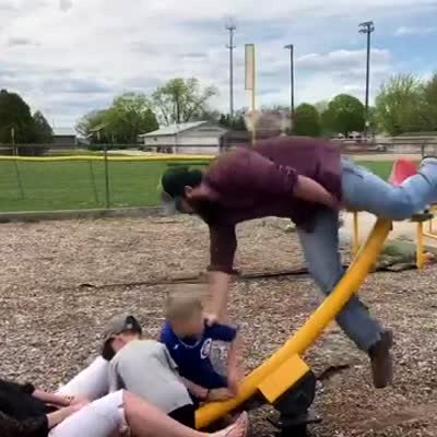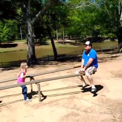 A man is playing with a boy on a see saw. At 0:46, the man gets hit hard in the face.