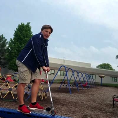 A teen boy rides a razor scooter across playground structures (see-saw) that tip up and hit him in his groin.