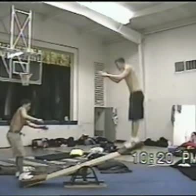 2 boys on see-saw try to go very high. 1 boy almost goes straight up in the air, the other boy falls off & the boy in the air face plants on the ground. Backyard.