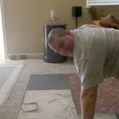 A grandfather does push-ups on a wooden plank in a living room and two young boys sit on the other end of the wooden plank and their grandmother pushes it down repeatedly like a see-saw.The wood breaks and the boys fall down and their grandfather falls and they laugh.