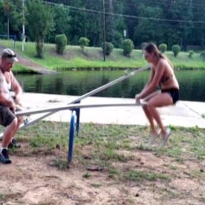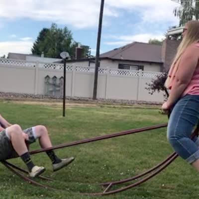 A man and a young woman play on a see saw outdoors. The man is heavier and knocks the young woman off her end.