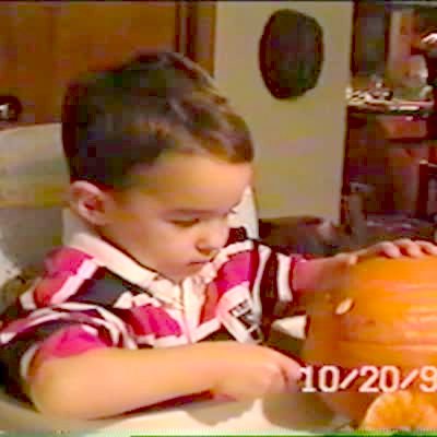 Kid gets face full of pumpkin seeds while gutting it. Halloween.