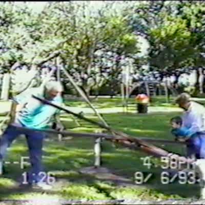 Playground - Grandma / senior woman and tot take a tumble off of seesaw